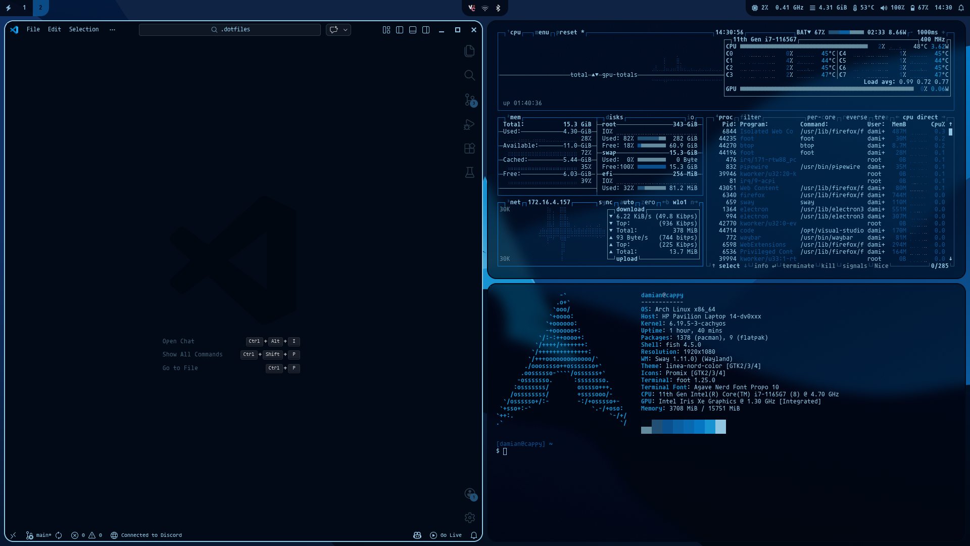 My every day duties happen on a Hinge Problems Pavilion 14. It runs Arch Linux btw since May 2024, and it's using SwayFX with uwsm
